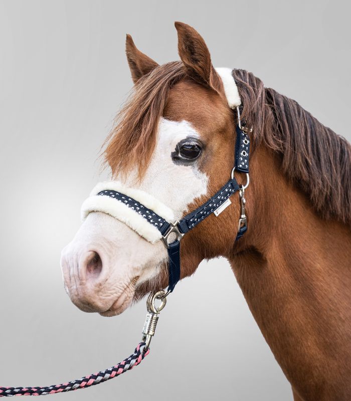 Ensemble composé d’un licol avec un adorable imprimé licornes sur toute la surface et d’une longe d’attache tricolore. Le licol est doublé de fausse fourrure au niveau de la têtière et de la muserolle. Réglage simple sur la nuque.