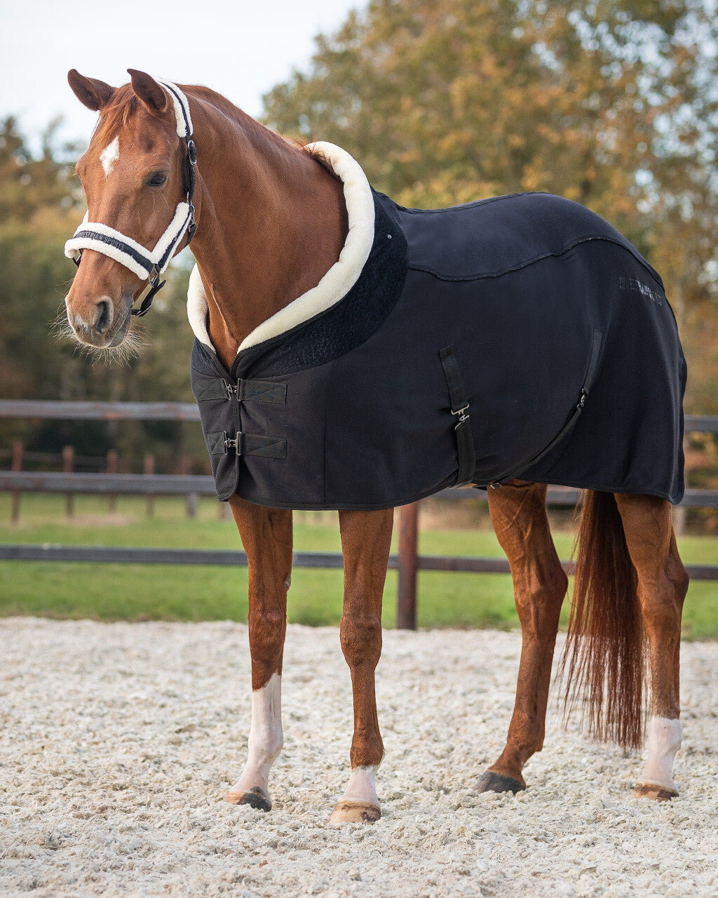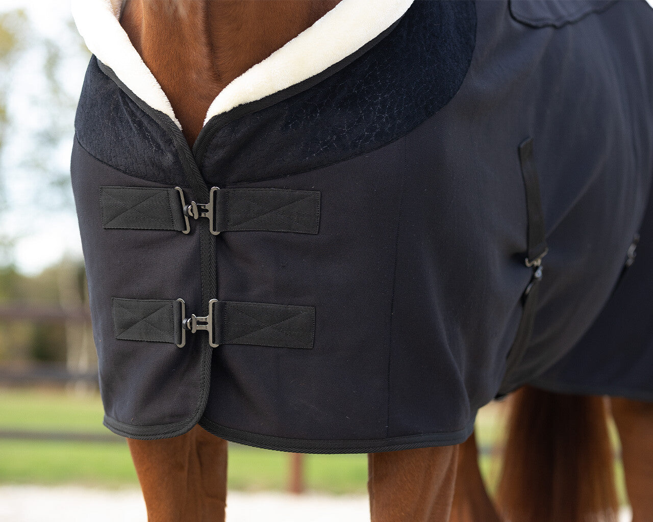 Mettez votre cheval en valeur avec cette luxueuse couverture d'écurie de la ligne Julin ! La couverture est pourvue d'un gros col en imitation fourrure et de sursangles détachables. La couverture a un magnifique imprimé crocodile sur le col.