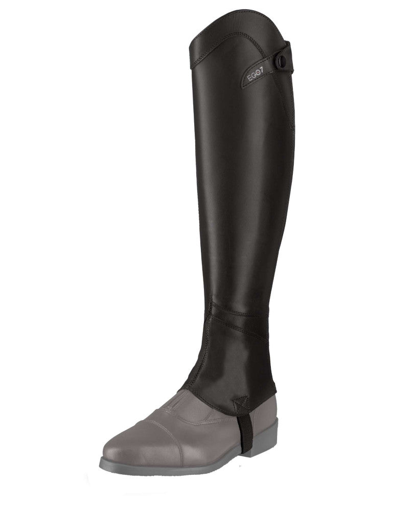 Mini-chaps EGO7 Lyra en cuir pleine fleur avec double élastique le long du zip arrière. Doublure suédée et panneau E-tex pour respirabilité et grip. Design élégant avec patchwork cuir et doubles coutures.