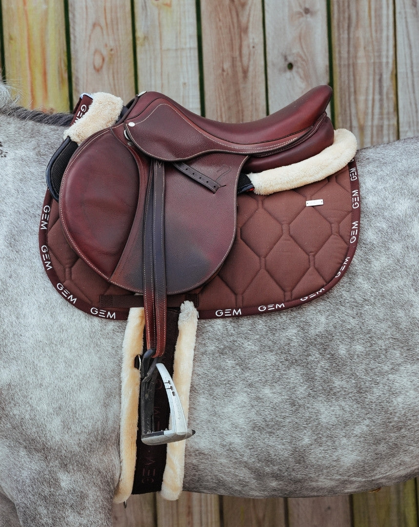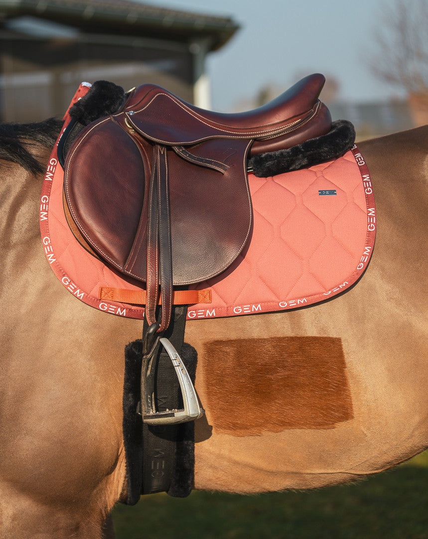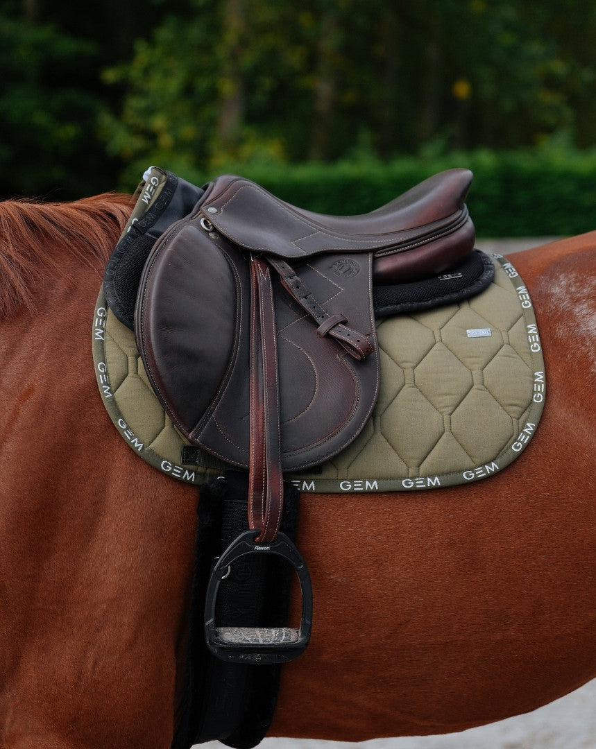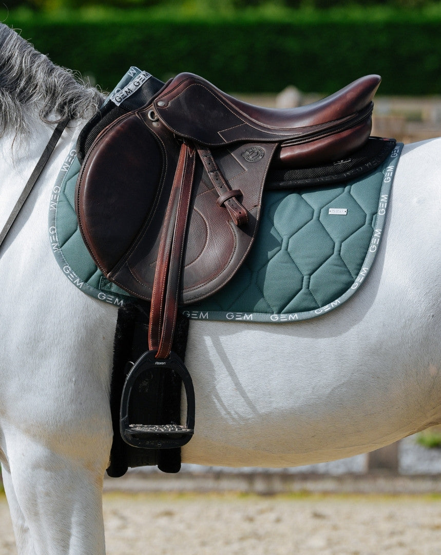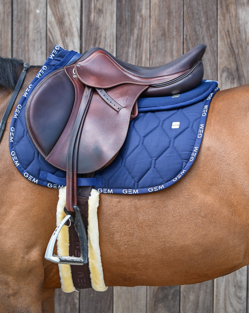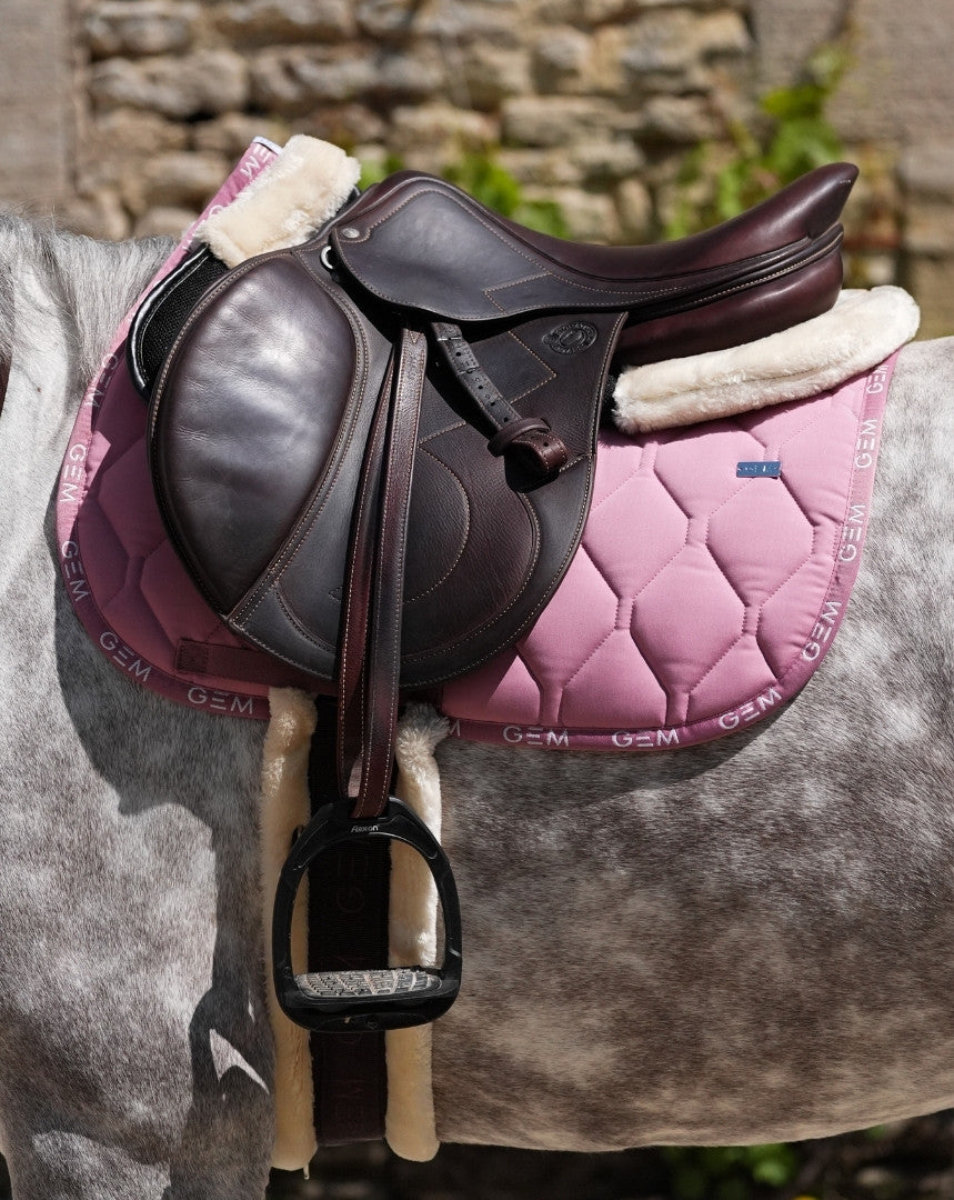 Nous utilisons un tissu interne technique nommé 3D ou Mesh. Ultra-respirant, il diminue la transpiration du cheval sous la selle et permet un séchage rapide du tapis. Les fibres qui le composent accentuent son pouvoir amortissant. Volontairement fin pour une meilleure proximité avec son cheval. L'intérieur est composé d'une ouate de 200g, amortissante et respirante.